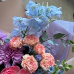Дельфиниум – 2 шт.Пион – 1 шт.Статица – 1 шт.Эвкалипт – 3 шт.Диантус – 6 шт.Роза пионовидная кустовая – 1 шт.Фисташка – 1 шт.Хризантема одноголовая – 2 шт.Твидия – 1 шт.
