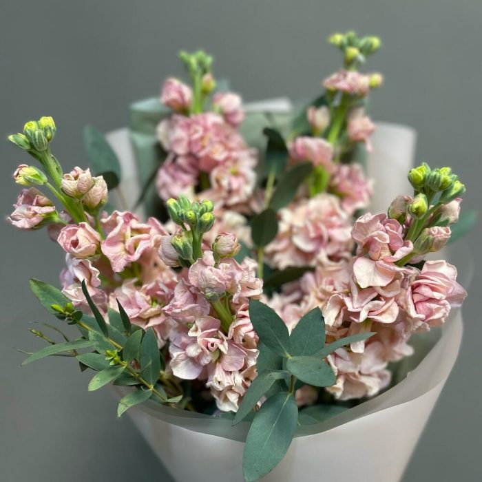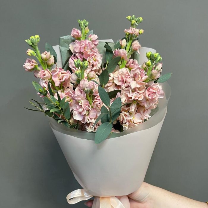 Лента атласная – 1 шт.Тишью – 2 шт.Пленка матовая – 6 шт.эвкалипт итальянский – 4 шт.маттиола персиковая ароматная – 5 шт.