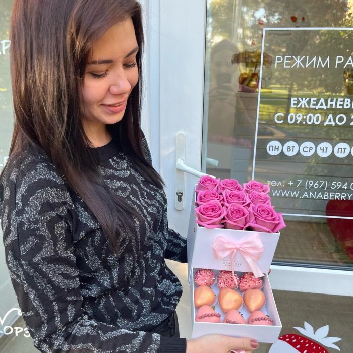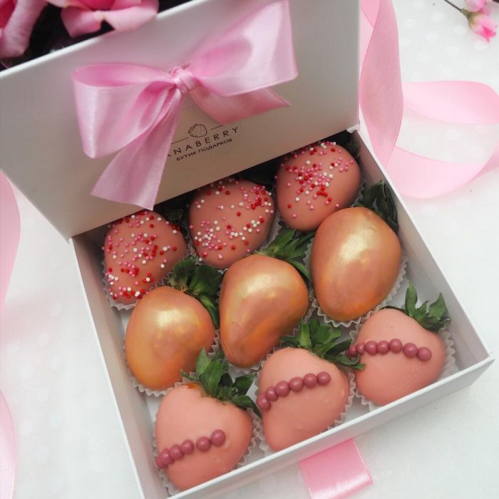 Мини шкатулка с кустовыми розами (9 клубничек в шоколаде)