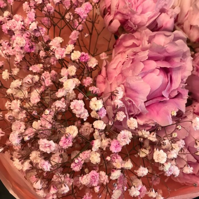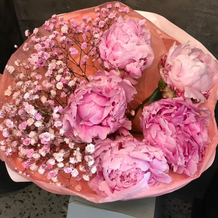 Гипсофила – 2 шт.Лента – 1 шт.Тишью – 2 шт.Пион Сара Бернар – 5 шт.Пленка матовая – 1 шт.Средство для продления жизни цветов – 1 шт.