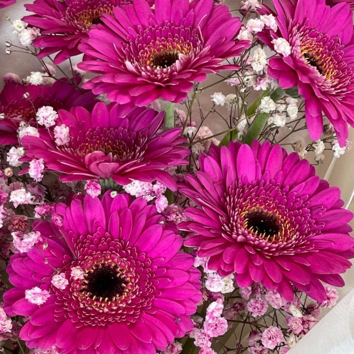 Гипсофила – 2 шт.Лента – 2 шт.Упаковка – 2 шт.Гербера мини – 11 шт.