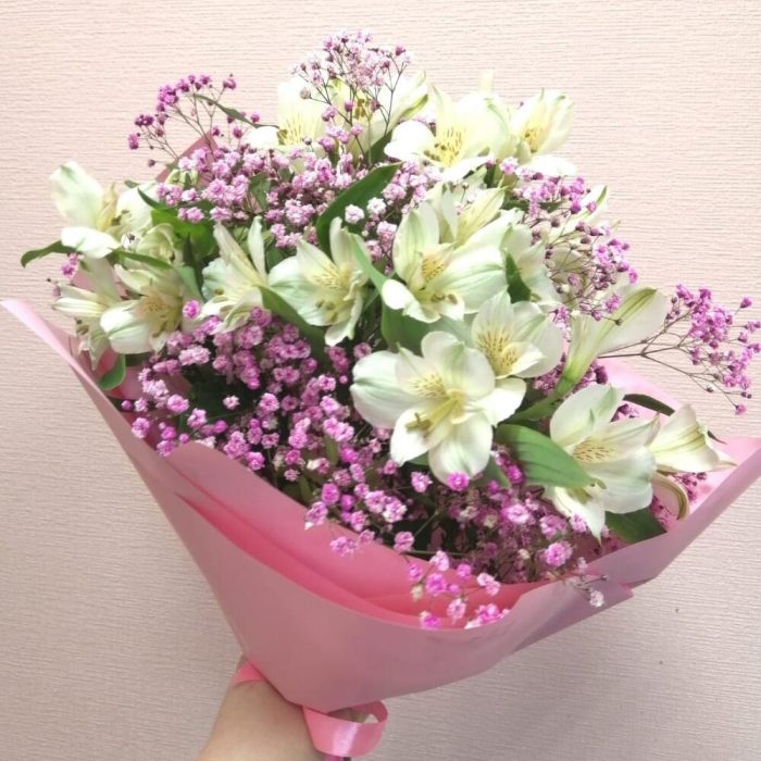 Альстромерия – 5 шт.Гипсофила – 2 шт.Лента – 1 шт.Упаковка дизайнерская – 1 шт.