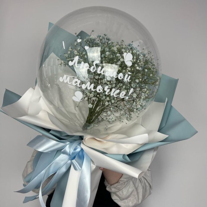 шар бабл – 1 шт.Гипсофила – 3 шт.наклейка фирменная – 1 шт.покнка матовая – 6 шт.Лента атласная – 4 шт.