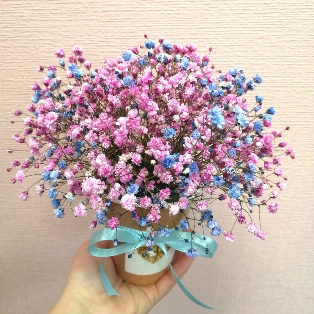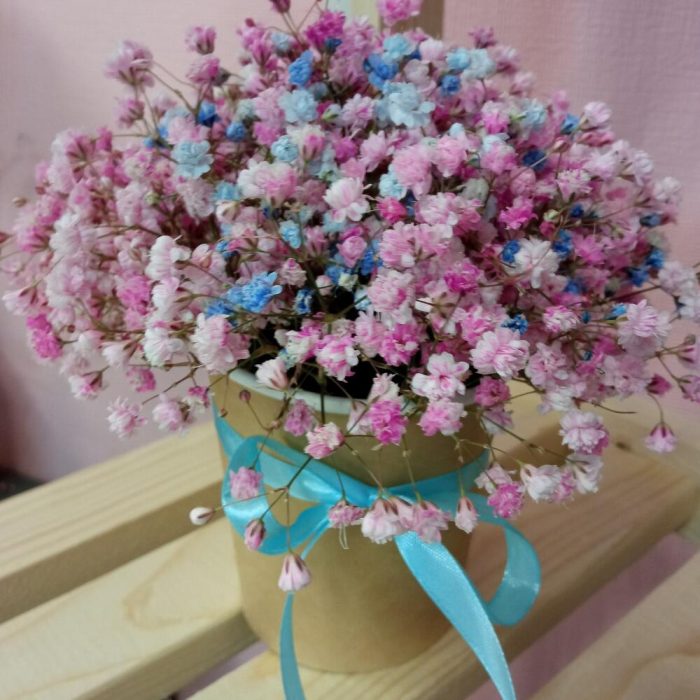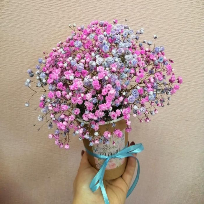 Лента атласная – 1 шт.Оазис флористический – 1 шт.стакан кофейный – 1 шт.гипсофила радужная – 2 шт.