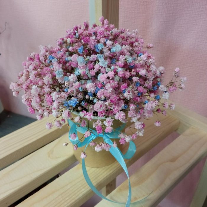 “Сиреневый туман” – композиция из гипсофилы в шляпной коробке