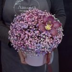 “Сиреневый туман” – композиция из гипсофилы в шляпной коробке