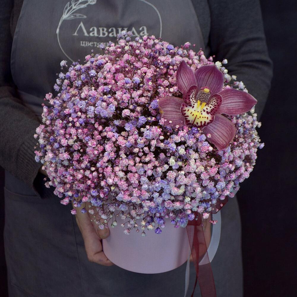 Шляпная коробка – 1 шт.орхидея – 1 шт.гипсофила разноцветная – 9 шт.