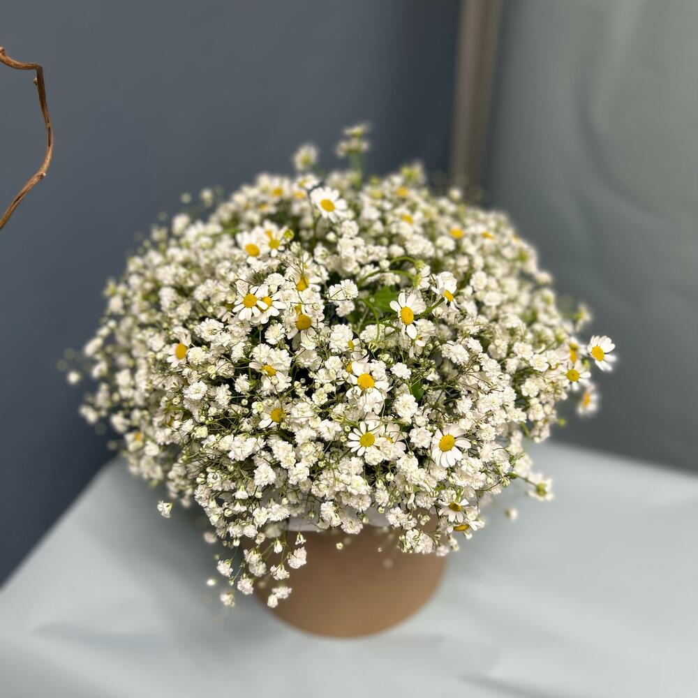 Коробка с гипсофилой и ромашкой