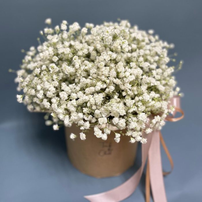“Сиреневый туман” – композиция из гипсофилы в шляпной коробке