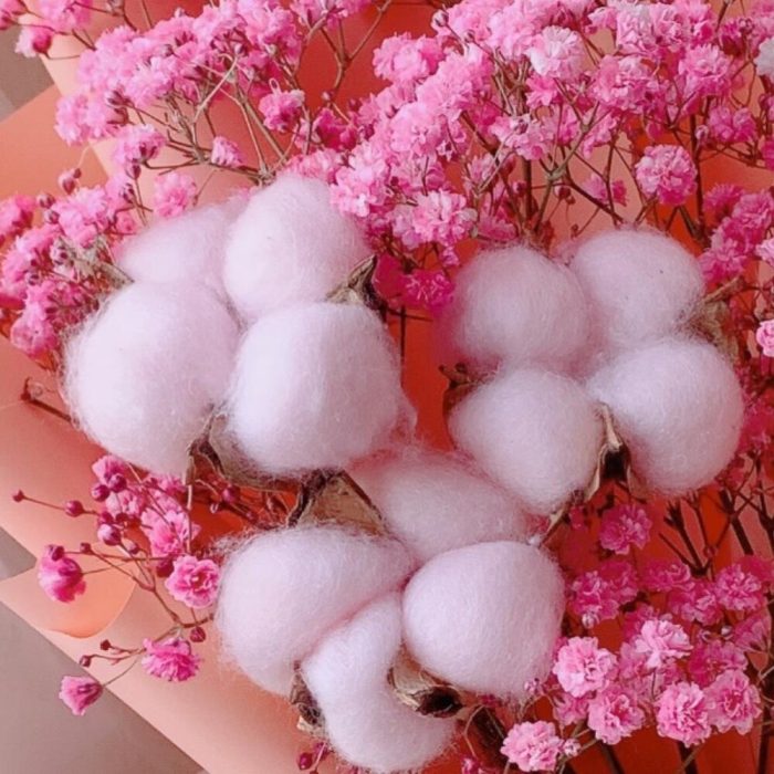 Хлопок – 3 шт.Лента атласная – 1 шт.Гипсофила розовая – 1 шт.Дизайнерская упаковка – 1 шт.