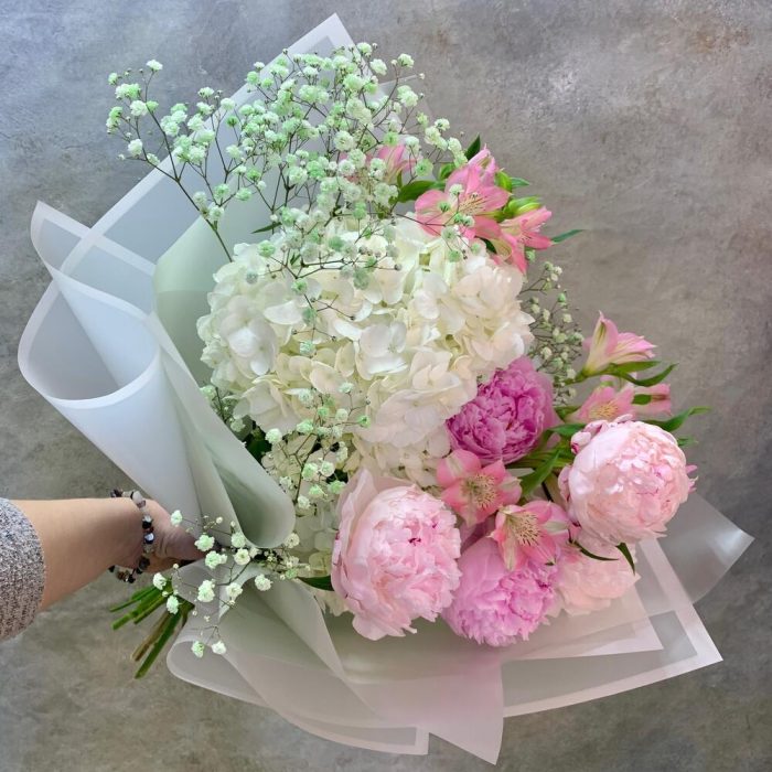 Пион Сара Бернар – 5 шт.Гортензия – 2 шт.Альстромерия – 3 шт.Гипсофила – 1 шт.Рускус – 3 шт.Упаковка дизайнерская – 2 шт.