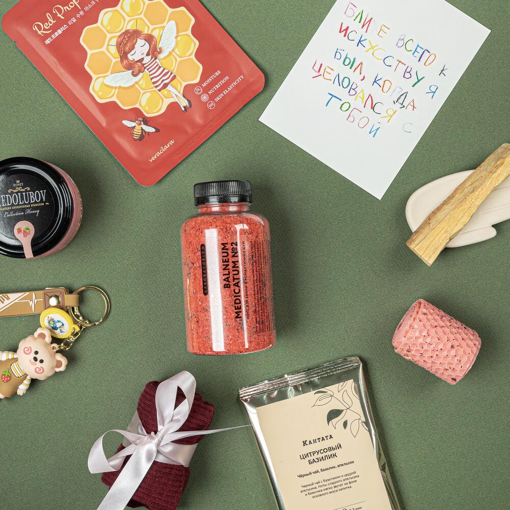 соль для ванной laboratorium – 1 шт.брелок для ключей – 1 шт.свеча из вощины – 1 шт.Мед-суфле – 1 шт.носочки универсального размера – 1 шт.благовоние пало санто – 1 шт.подставка-ладошка для благовоний из гипсофила – 1 шт.чай кантата – 1 шт.тканевая маска для лица – 1 шт.