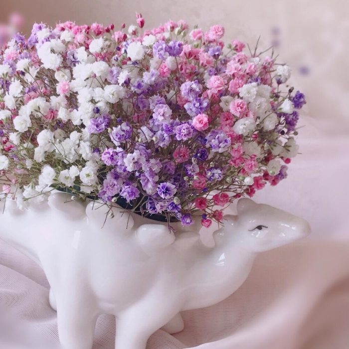 Радужная гипсофила в керамическом кашпо «Стегозавр»