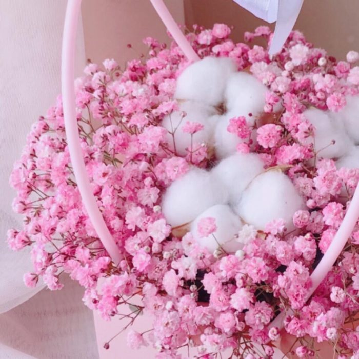 Очаровательная композиция из изысканных свежих цветов.Наполнена множеством соцветий розовой гипсофилы и мягкого хлопка. Собрана в стильной сумочке.Композиция из гипсофилы – необычный подарок, который удивит своей невероятной стойкостью, при правильном и простом уходе.❤️ Ставить композицию в прохладном месте, избегая отопительных приборов и прямых солнечных лучей. ❤️ Подливать немного воды в серединку.Гипсофила не вянет, а становится сухоцветом, сохраняя свой вид. Поэтому композиция продолжит радовать ещё очень долго!Чтобы защитить готовый букет во время доставки от любых погодных условий, мы бережно его упаковываем