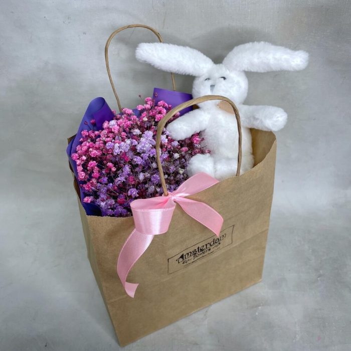 Гипсофила – 3 шт.Упаковка – 1 шт.игрушка зайчонок lapkin – 1 шт.Пакет крафт – 1 шт.