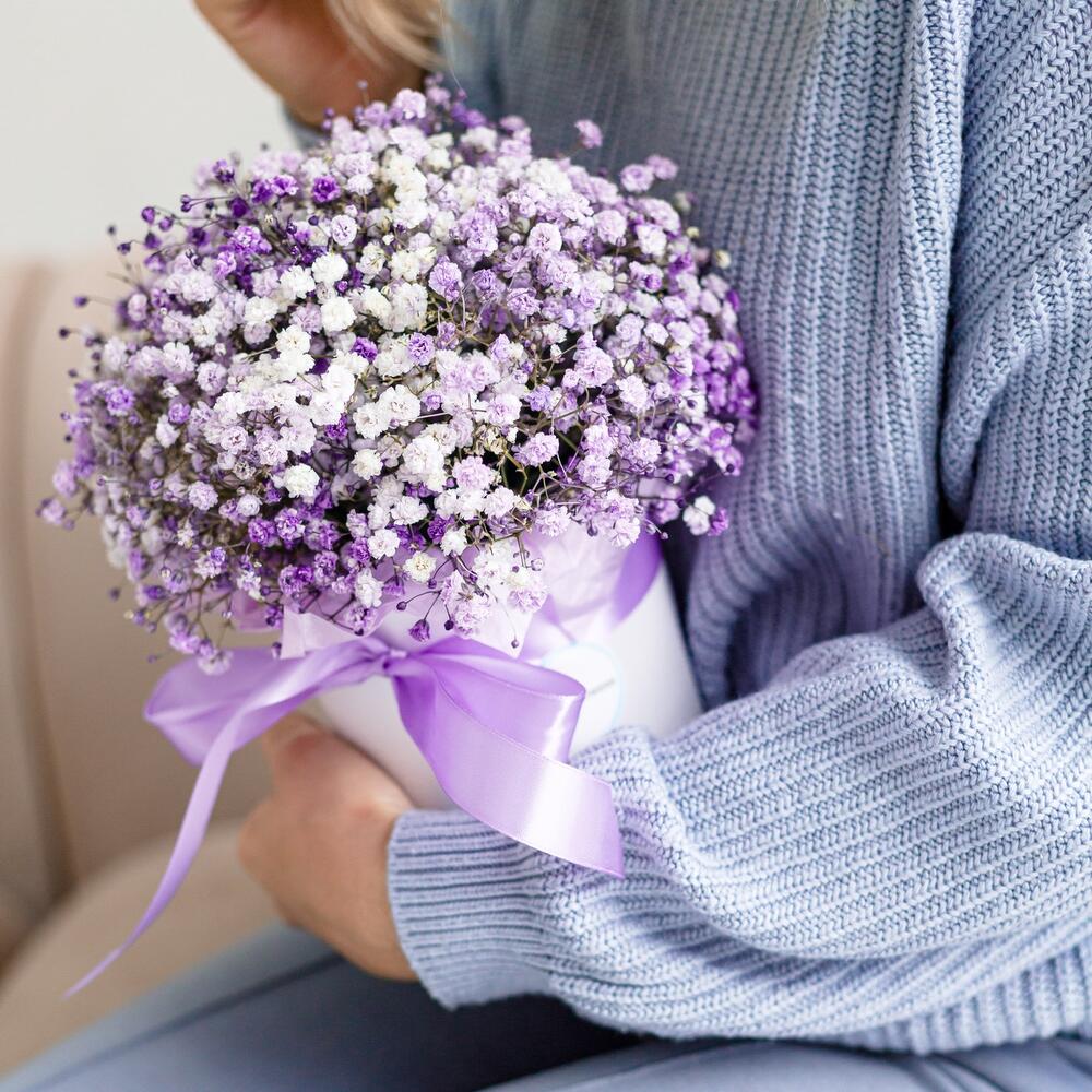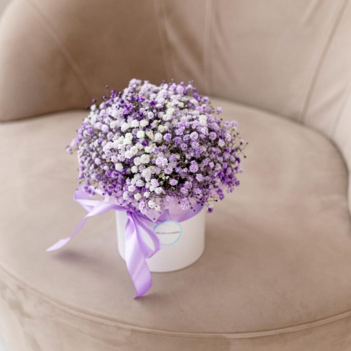 “Сиреневый туман” – композиция из гипсофилы в шляпной коробке