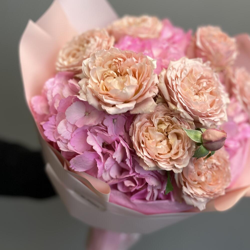 Букет из гортензии и кустовой пионовидной розы Juliet