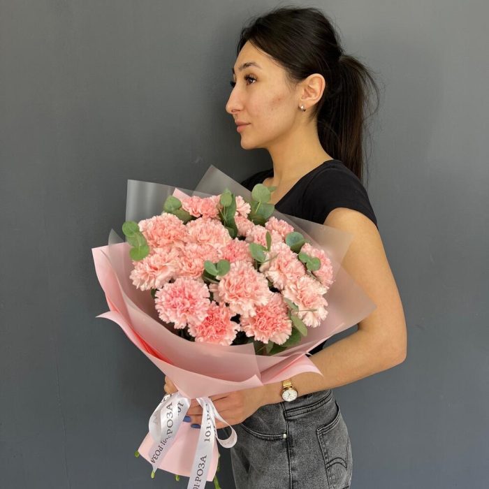 17 нежно-розовых диантусов с эвкалиптом