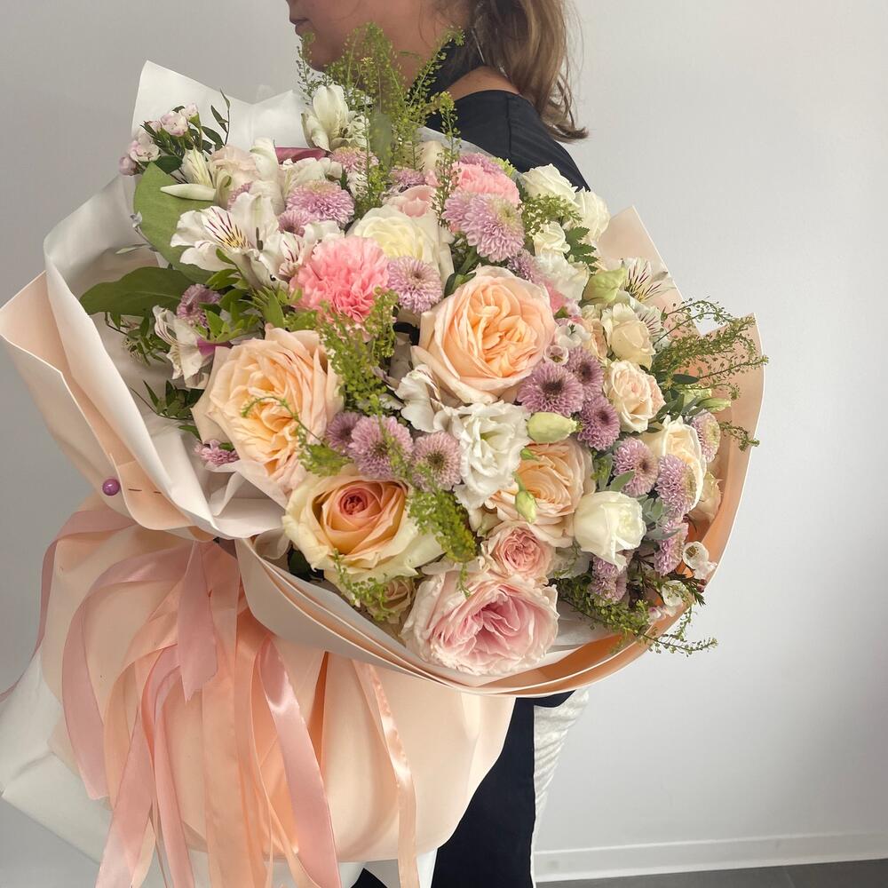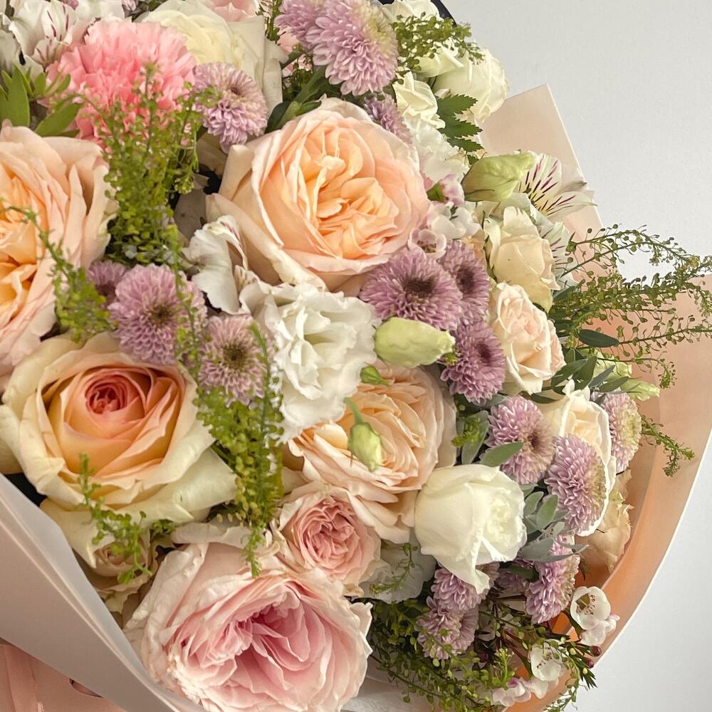 роза охара пионовидная – 11 шт.Кустовая роза – 11 шт.Сантинии – 11 шт.эустома белая – 3 шт.Гвоздика сортовая – 11 шт.Альстромерия – 11 шт.Зелень – 10 шт.Тишью белое – 2 шт.Фоамиран – 2 шт.Лента – 2 шт.