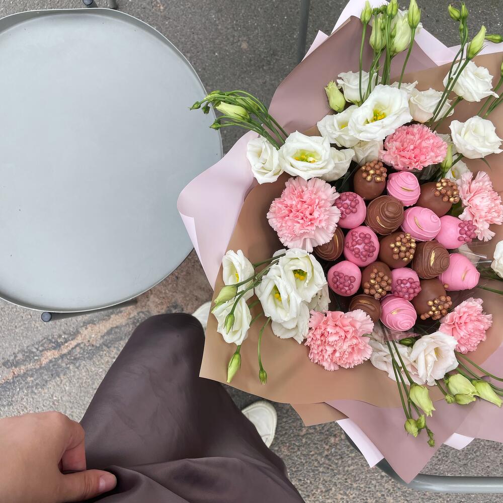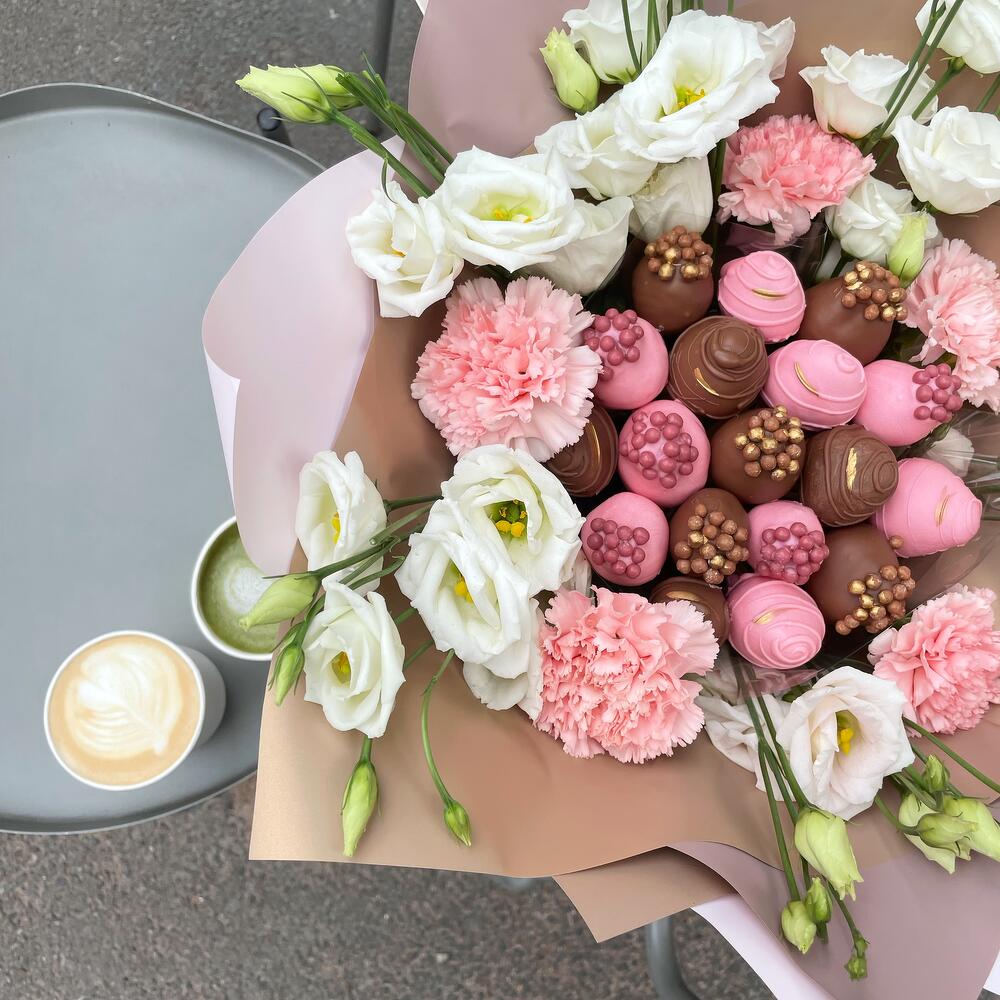 эустома белая – 6 шт.диантус нежно розовый – 5 шт.свежая клубника в бельгийском шоколаде – 450 гр.