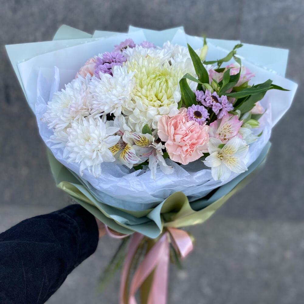 Альстромерия – 4 шт.Хризантема кустовая – 2 шт.Лента атласная – 5 шт.Диантус – 4 шт.Сантини – 3 шт.Упаковка дизайнерская – 7 шт.магнум белый – 1 шт.