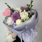 Хризантема – 3 шт.white o’hara – 3 шт.Хлопок – 3 шт.Диантус – 3 шт.Фисташка пучок – 1 шт.Эвкалипт – 2 шт.Пленка матовая – 4 шт.Тишью – 6 шт.Лента – 2 шт.