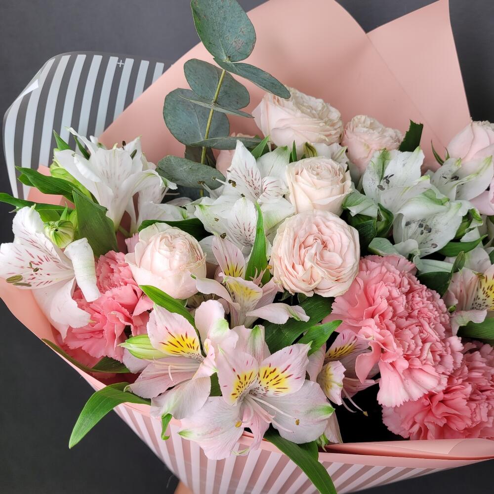 Роза кустовая – 2 шт.Альстромерия – 5 шт.Диантус – 3 шт.Эвкалипт – 1 шт.Упаковка дизайнерская – 1 шт.Лента атласная – 1 шт.