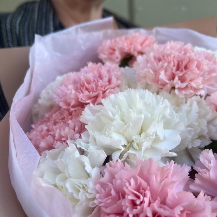 Лента атласная – 2 шт.Тишью – 1 шт.Диантус белый – 7 шт.Упаковка корейская пленка – 1 шт.диантус нежно-розовый – 10 шт.