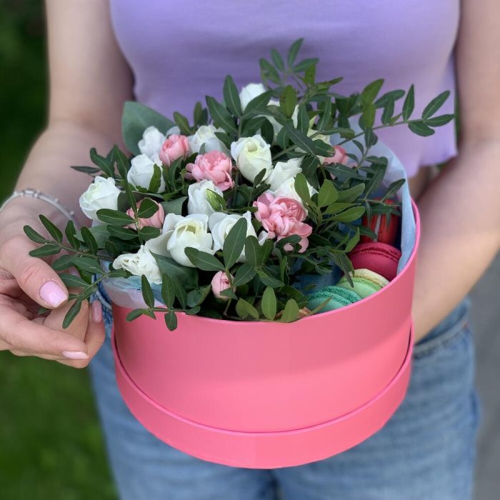 Коробочка из эустомы, кустовой гвоздички, зелени, с добавлением любимых макарун.