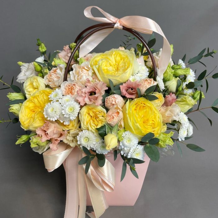 пионовидная желтая роза – 3 шт.Кустовая роза – 5 шт.Диантус – 3 шт.Диантус кустовой – 3 шт.Эустома – 3 шт.Сантини – 3 шт.Эвкалипт – 2 шт.Альстромерия – 3 шт.Сумочка – 1 шт.Оазис флористический – 1 шт.ленты атласные – 3 шт.