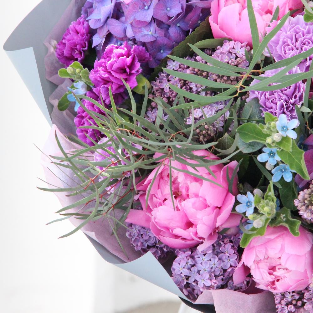 Лиловый поцелуй – Гортензии, пионы и восковой мирт