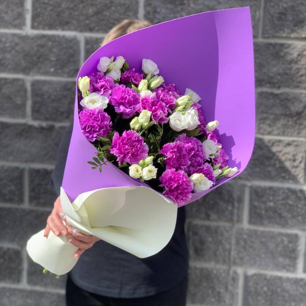 Диантус – 15 шт.Лизиантус – 5 шт.Фисташка – 3 шт.Упаковка дизайнерская – 1 шт.Лента атласная – 1 шт.