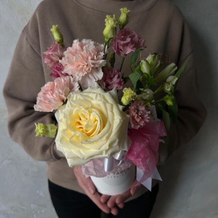 Альстромерия – 1 шт.Лизиантус – 1 шт.Гвоздика – 2 шт.Коробка шляпная – 1 шт.Пионовидная роза – 1 шт.Оазис – 1 шт.