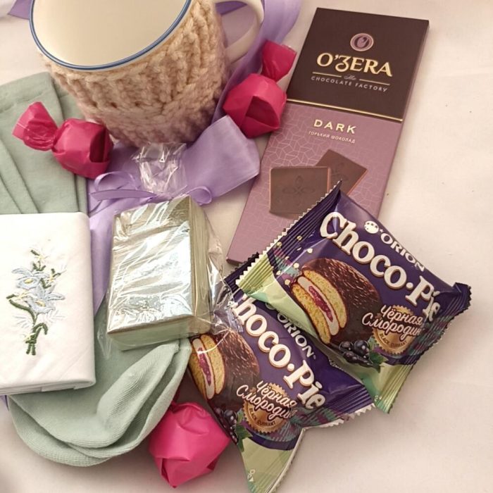 Оригинальный подарочный набор с тем, что может удивить и порадовать любимого человека ❤В подарочный бокс входит:- Керамическая кружка белого цвета (300мл) с вязаным вручную бежевым свитерком (снимается); уютная деталь не помешает чаепитию, верхняя часть кружки свободна)- Сережки-сердечки голубого цвета из специальной легкой глины, вес которой не ощущается при носке- Хлопковый платочек белого цвета с вышивкой цветов- Аирное мыло для ухода за проблемной кожей- Хлопковые носочки (2 пары)- Шоколадные конфеты (3 шт)- Темный (горький) шоколад с 55% какао в составе (1 шт)- Choco-Pie с черной смородиной (2шт)Набор упакован в подарочную упаковку лавандового цвета и крафтовую коробку с рисунком лаванды и надписью «Для тебя» внутри ❤Наши необычные подарки придутся по душе каждой дочке, жене, маме, бабушке, любимой девушке или коллеге. Также поможем удивить отцов, дедушек, сыновей или внуков. Ведь пол и роль не важны, зато бывает так важно подарить чуточку внимания и тепла) А у нас есть все, чтобы Вам с этим помочь ❤Вы можете изменить состав подарочного бокса: -добавить открытку в конверте или без, в которой мы напишем Ваше позд