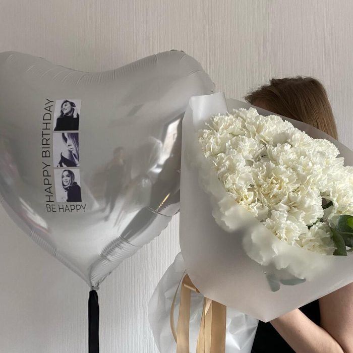 Эвкалипт – 1 шт.Белый диантус – 19 шт.сердце фольгированное с фотографиями – 1 шт.