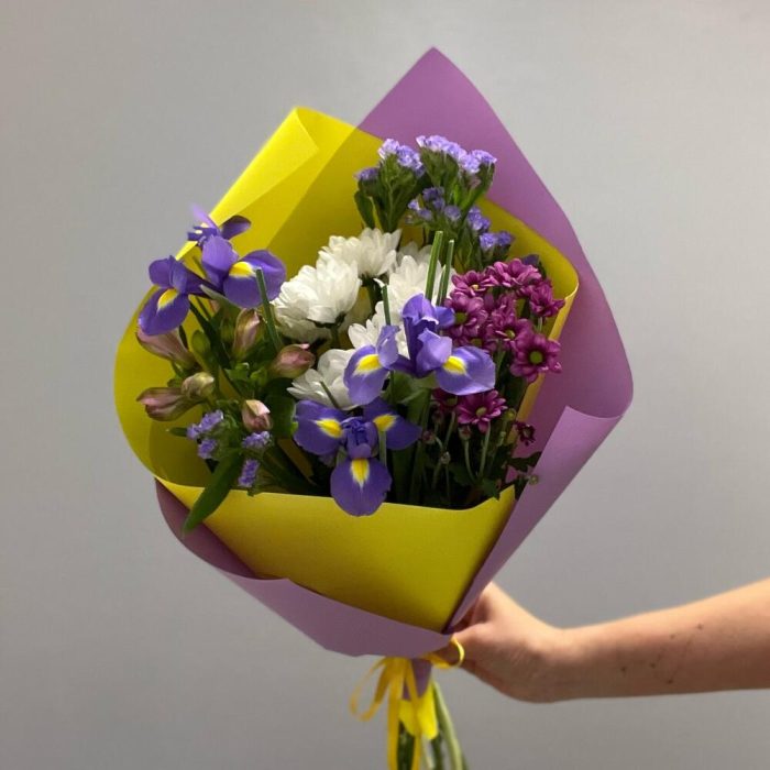 Ирис – 3 шт.Альстромерия – 1 шт.Хризантема кустовая – 2 шт.Статица – 2 шт.Упаковка дизайнерская – 2 шт.Лента атласная – 1 шт.