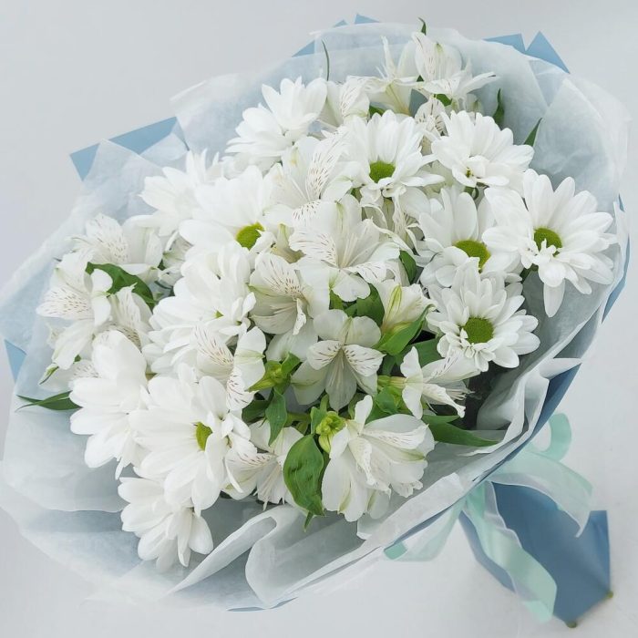 Стойкий букет из ромашковых хризантем и альстромерий. Такой букет всегда уместен и подойдёт для любого повода: День Рождения, именины, годовщина свадьбы, рождение ребенка, 8 марта, День Святого Валентина, выпускной и т.д. Можно вручить маме, сестре, подруге, коллеге, учителю, любимой.