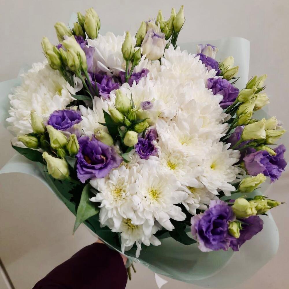 Хризантема кустовая – 5 шт.Лизиантус (эустома) – 10 шт.упаковка подарочная – 1 шт.