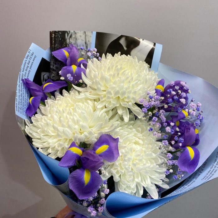 Хризантема – 3 шт.Ирис Blue Magic – 5 шт.Гипсофила – 1 шт.оформление дизайнерское – 1 шт.
