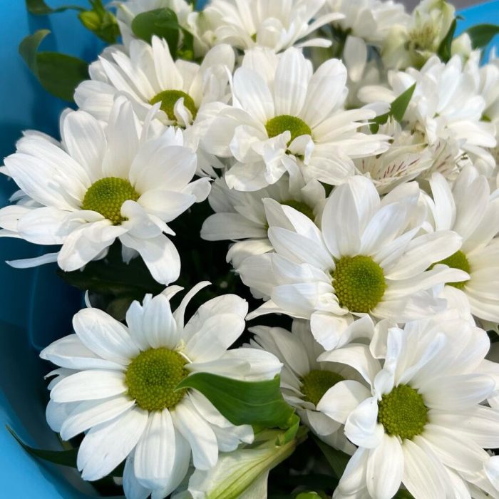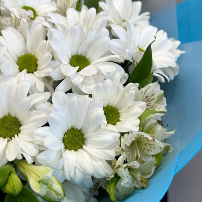 Альстромерия – 6 шт.Хризантема кустовая – 5 шт.Лента атласная – 2 шт.Упаковка дизайнерская – 2 шт.