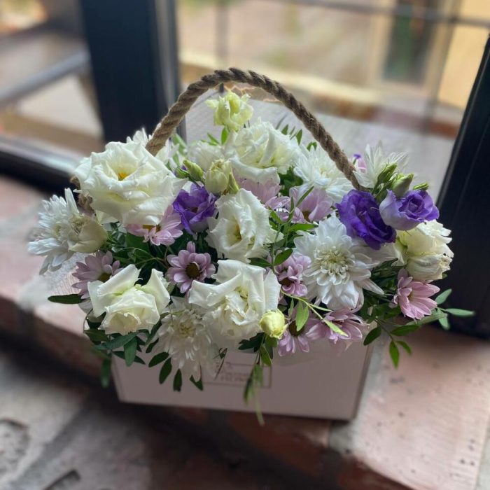 Хризантема кустовая – 2 шт.Хризантема кустовая ромашка – 1 шт.эустома белая – 2 шт.эустома сиреневая – 1 шт.Фисташка – 2 шт.Бокс деревянный – 1 шт.Оазис – 1 шт.