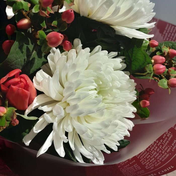 Тюльпан – 2 шт.Лента атласная – 2 шт.Фисташка – 2 шт.Хиперикум – 4 шт.Упаковка дизайнерская – 2 шт.Хризантема Антонов – 3 шт.