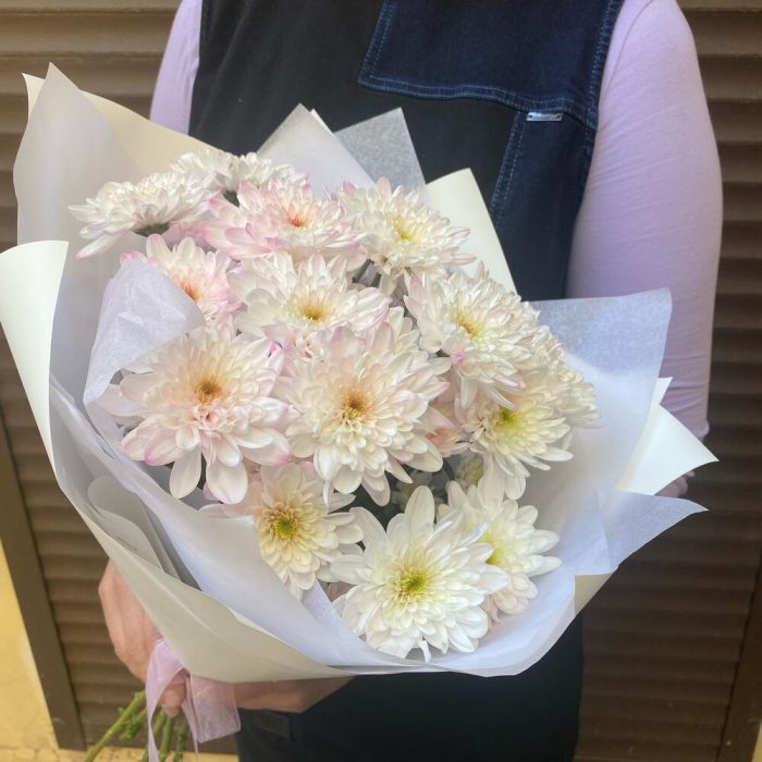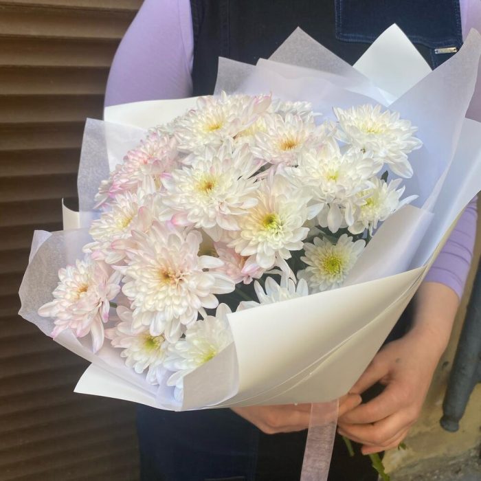 Хризантема кустовая – 5 шт.Лента атласная – 1 шт.Тишью белое – 1 шт.Пленка дизайнерская – 2 шт.