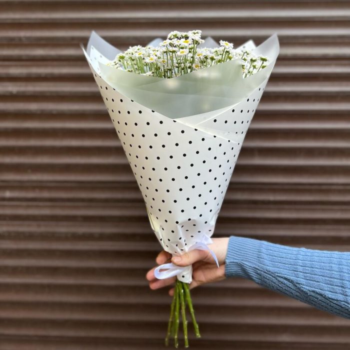 Лента атласная – 2 шт.Пленка матовая – 1 шт.Хризантема сантини ромашка – 7 шт.Дизайнерская упаковка – 1 шт.