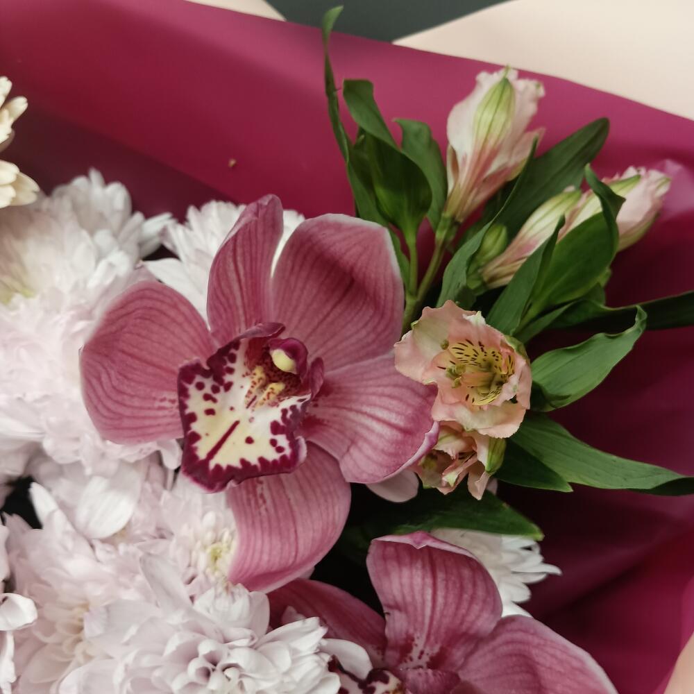 ЦИМБИДИУМ – 3 шт.Гербера мини – 3 шт.Хлопок натуральный – 3 шт.Хризантема кустовая – 3 шт.Альстромерия – 1 шт.Упаковка дизайнерская – 1 шт.