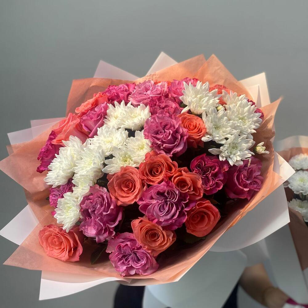 Альстромерии, Гвоздики, Кустовые розы, Лизиантусы, Розы, Хризантемы