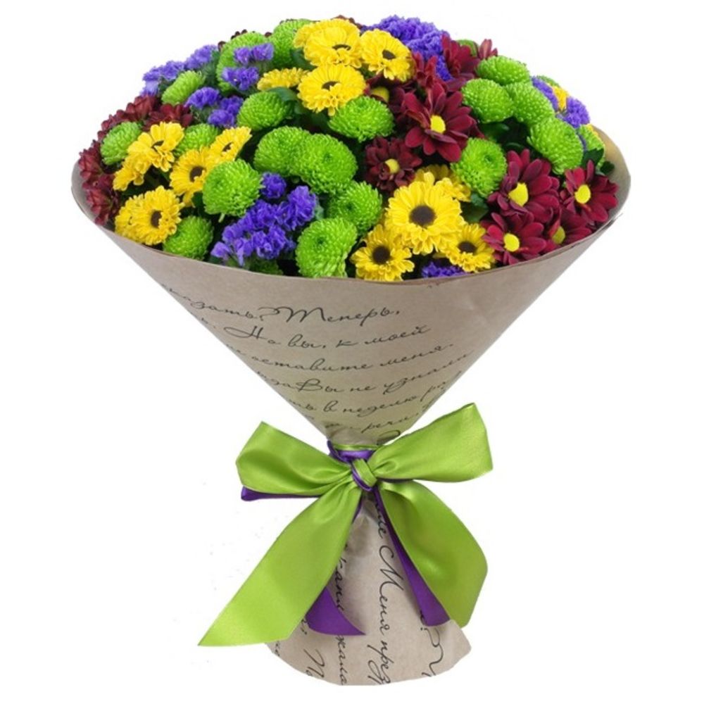лента декоративная – 1 шт.бумага упаковочная – 1 шт.Статица синяя – 5 шт.Хризантема сантини желтая – 5 шт.Хризантема сантини зеленая – 5 шт.хризантема сантини красная – 5 шт.