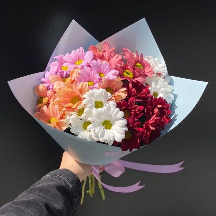 Хризантема кустовая – 7 шт. Упаковка дизайнерская – 2 шт. Открыточка с вашими пожеланиями – 1 шт.