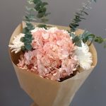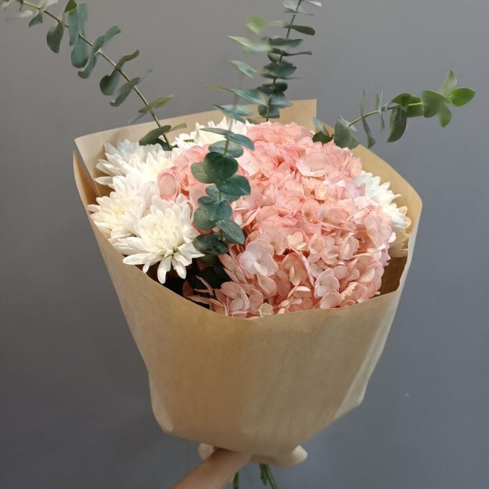 Хризантема кустовая – 4 шт. Эвкалипт – 3 шт. Гортензия розовая – 1 шт.