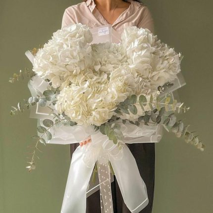 Красивая и пышная гортензия в окружении хризантемы, которая придаёт легкости и ещё больший объём букету